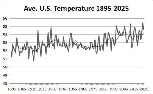 The graph below depicts annual, average temperatures in the United States from 1895-2025.  The dark ‘trend’ line in the middle is a 7-year moving average of the data.  Notice that the trend has been going up since the 1970s.  Beginning in 1998 temperatures have trended down but are still above average (straight diagonal line) the majority of years.  A previous long period of above normal temperatures took place from 1930-1947.  The extreme high temperatures resulted in the Dust Bowl of the 30s and the rise of worldwide fascism.  The extreme record-breaking weather patterns to date first emerged in the 1990s. Weird weather patterns continue as global warming marches on. The current long-term warming trend is expected to rise by 1.1 – 2.9 degrees by the end of the century according to the Intergovernmental Panel on Climate Change.  [Read more about long-range climate change in the article “THE NEW WORLD AGE.”]